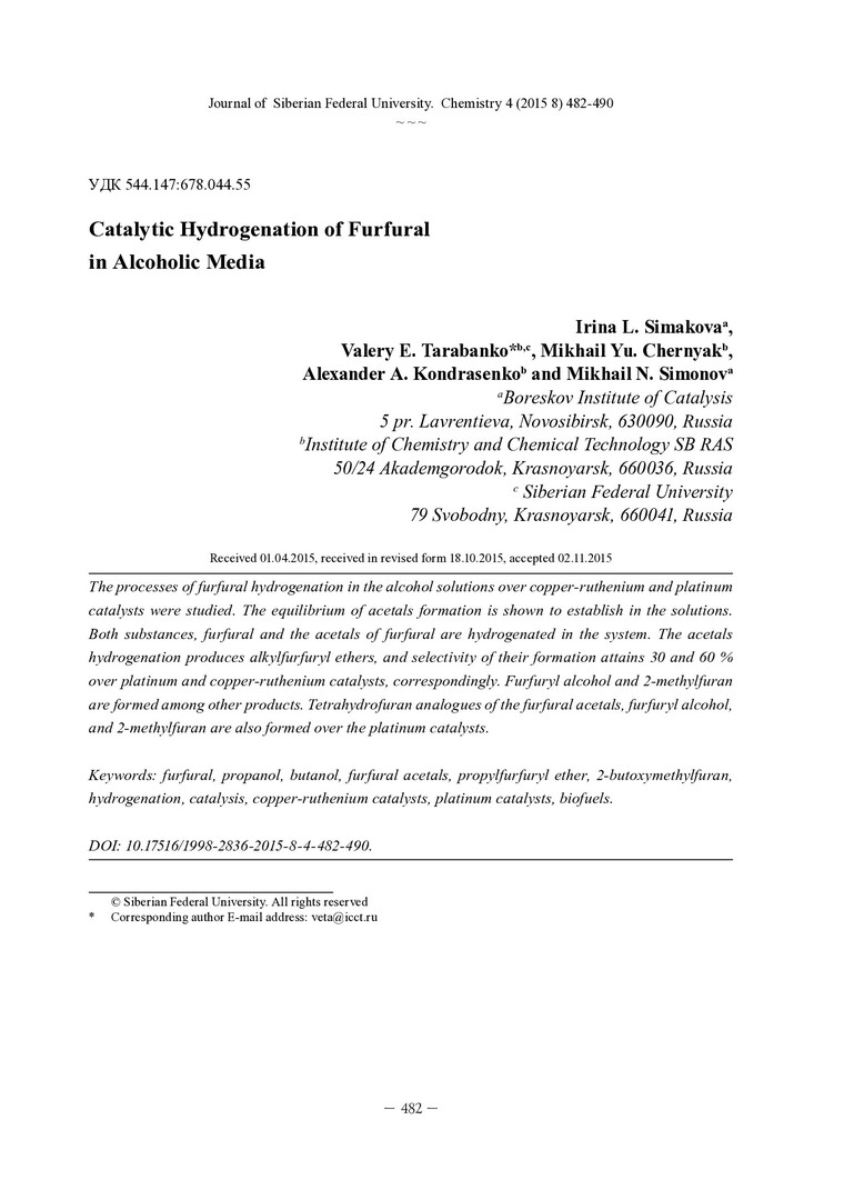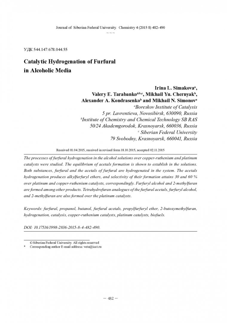 Аннотация:Изучен процесс гидрирования фурфурола в спиртовых средах на медно-рутениевых и платиновых катализаторах. Показано, что в растворах устанавливается равновесие фурфурол – ацеталь фурфурола, и гидрируются оба эти вещества.