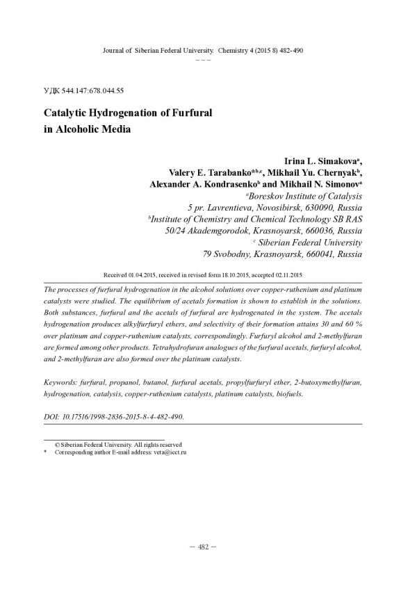 Библиографическое описание:Каталитическое гидрирование фурфурола в спиртовых средах = Catalytic Hydrogenation of Furfural in Alcoholic Media / И. Л. Симакова [и др.]. - Текст : непосредственный // Журнал Сибирского федерального университета. Химия. - 2015. - Т. 8, № 4. - С. 482-490 : ил. - Библиогр.: с. 490 (15 назв.).
