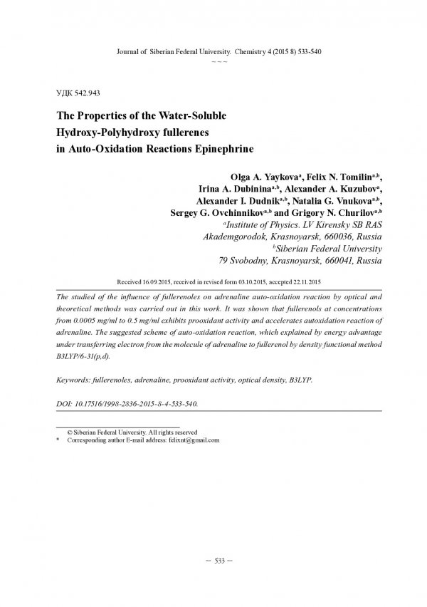 Библиографическое описание:Свойства водорастворимых окси-полигидрокси фуллеренов в реакции автоокисления адреналина = The Properties of the Water-Soluble Hydroxy-Polyhydroxy fullerenes in Auto-Oxidation Reactions Epinephrine / О. А. Яйкова [и др.]. - Текст : непосредственный // Журнал Сибирского федерального университета. Химия. - 2015. - Т. 8, № 4. - С. 533-540 : ил. - Библиогр.: с. 538-540 (16 назв.). - ISSN 1998-2836.