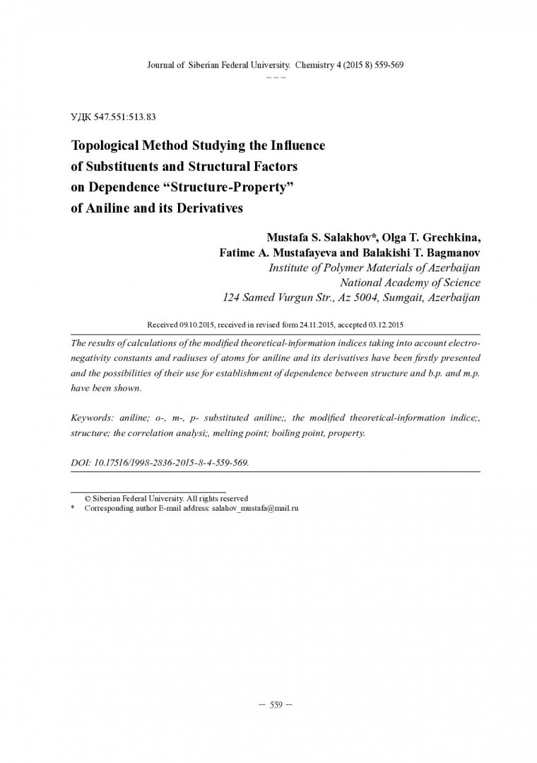 Библиографическое описание:Топологический метод изучения влияния заместителей и структурных факторов на зависимость "структура–свойство" анилина и его производных = Topological Method Studying the In? uence of Substituents and Structural Factors on Dependence “Structure-Property” of Aniline and its Derivatives / М. С. Салахов. - Текст : непосредственный // Журнал Сибирского федерального университета. Химия. - 2015. - Т. 8, № 4. - С. 559-569 : ил. - Библиогр.: с. 566-569 (24 назв.). - ISSN 1998-2836.