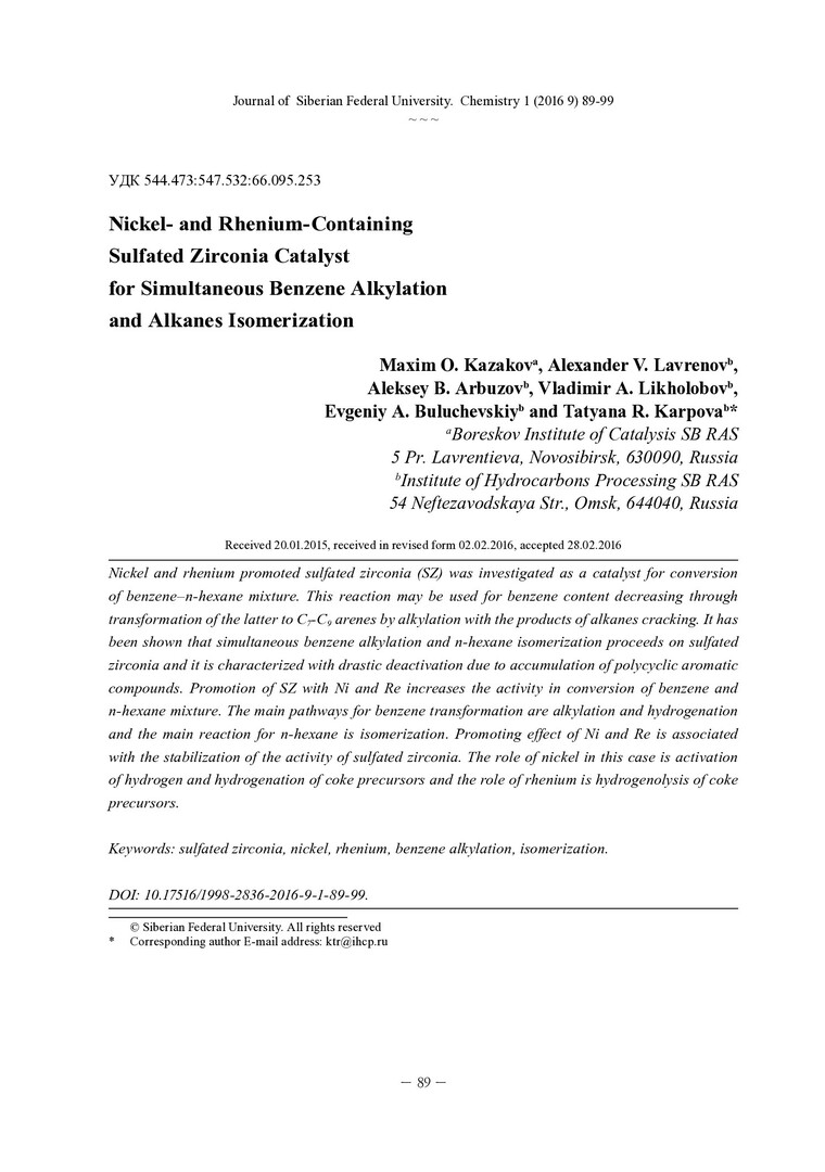 Библиографическое описание: Nickel- and Rhenium-Containing Sulfated Zirconia Catalyst for Simultaneous Benzene Alkylation and Alkanes Isomerization = Никель- и ренийсодержащие катализаторы на основе сульфатированного диоксида циркония для совместного алкилирования бензола и изомеризации алканов. - Текст : непосредственный // Журнал Сибирского федерального университета. Химия. - 2016. - Т. 9, № 1. -С. 89-99 : ил. - Библиогр.: с. 97-99 (20 назв.). - ISSN 1998-2836.