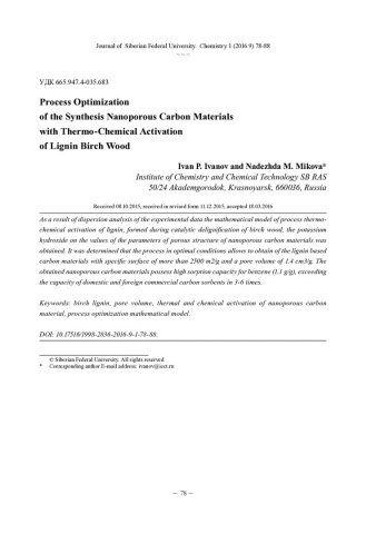 Библиографическое описание:Иванов, И. П. Оптимизация процесса синтеза нанопористых углеродных материалов при термохимической активации лигнина древесины березы / И. П. Иванов, = Process Optimization of the Synthesis Nanoporous Carbon Materials with Thermo-Chemical Activation of Lignin Birch Wood. - Текст : непосредственный // Журнал Сибирского федерального университета. Химия. - 2016. - Т. 9, № 1. -С. 78-88 : ил. - Библиогр.: с. 88 (35 назв.). - ISSN 1998-2836.