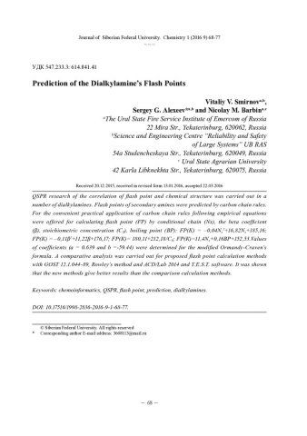Библиографическое описание:Смирнов, В. В. Прогнозирование температуры вспышки диалкиламинов / В. В. Смирнов, С. Г. Алексеев, Н. М. Барбин = The Ural State Fire Service Institute of Emercom. - Текст : непосредственный // Журнал Сибирского федерального университета. Химия. - 2016. - Т. 9, № 1. -С. 68-77 : ил. - Библиогр.: с. 74-77 (35 назв.). - ISSN 1998-2836.