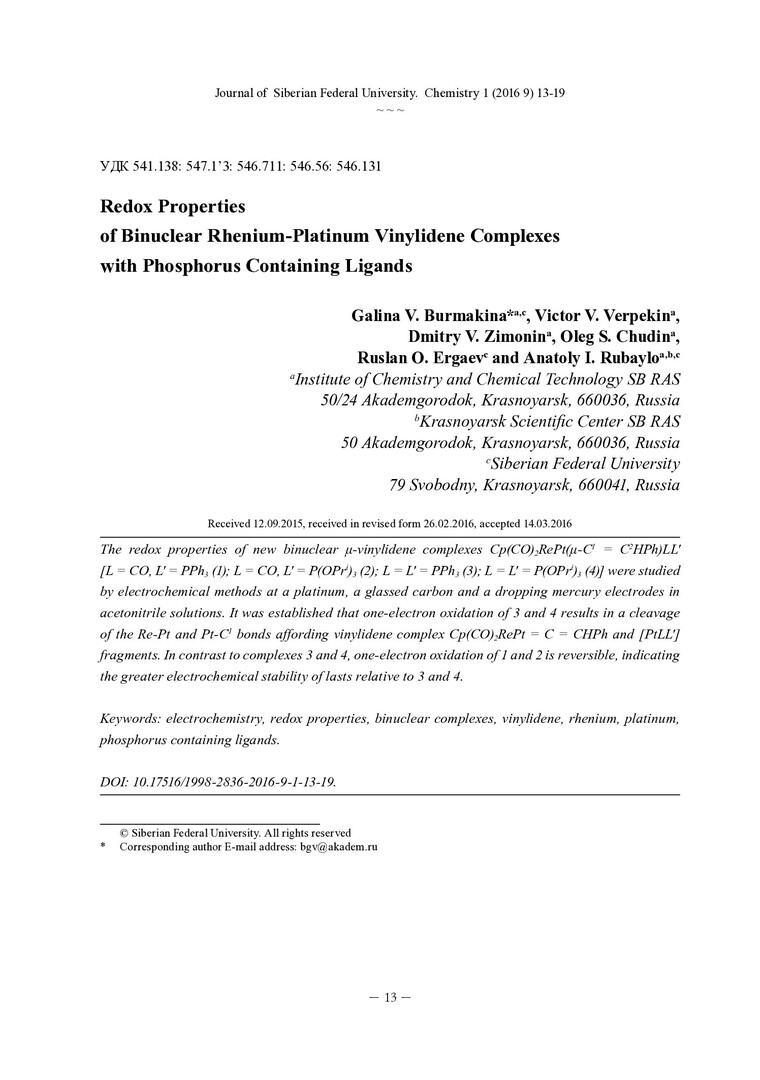 Библиографическое описание: Редокс-свойства биядерных рений-платиновых винилиденовых комплексов с фосфорсодержащими лигандами = Redox Properties of Binuclear Rhenium-Platinum Vinylidene Complexes with Phosphorus Containing Ligands. - Текст : непосредственный // Журнал Сибирского федерального университета. Химия. - 2016. - Т. 9, № 1. -С. 13-19 : ил. - Библиогр.: с. 18-19 (15 назв.). - ISSN 1998-2836.