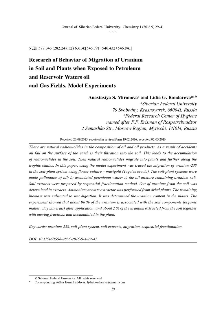 Библиографическое описание:Миронова, А. С. Исследование особенностей миграции урана в почве и растениях при воздействии нефти и пластовых вод нефтегазопромысла. Модельные эксперименты / А. С. Миронова, = Research of Behavior of Migration of Uranium in Soil and Plants when Exposed to Petroleum and Reservoir Waters oil and Gas Fields. Model Experiments. - Текст : непосредственный // Журнал Сибирского федерального университета. Химия. - 2016. - Т. 9, № 1. -С. 29-41 : ил. - Библиогр.: с. 38-41 (41 назв.). - ISSN 1998-2836.