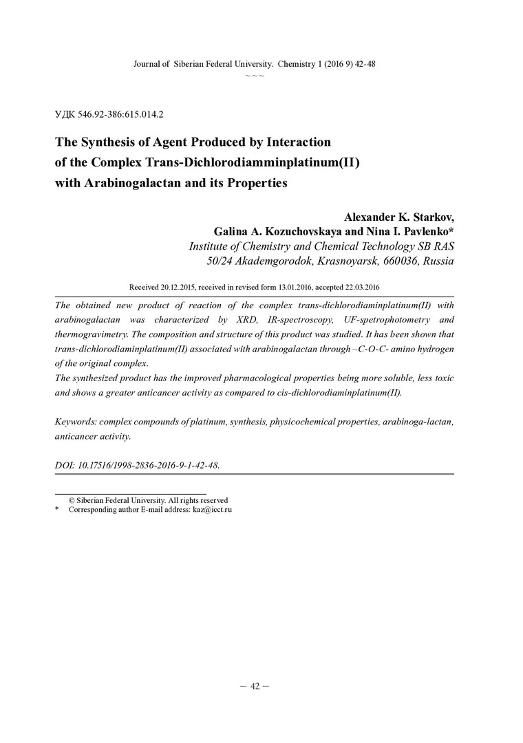 Библиографическое описание:Старков, А. К. Получение препарата на основе взаимодействия соли транс-дихлородиамминплатины (II) с арабиногалактаном и его свойства / А. К. Старков, Г. А. Кожуховская, Н. И. Павленко = The Synthesis of Agent Produced by Interaction of the Complex Trans-Dichlorodiamminplatinum(II) with Arabinogalactan and its Properties. - Текст : непосредственный // Журнал Сибирского федерального университета. Химия. - 2016. - Т. 9, № 1. -С. 42-48 : ил. - Библиогр.: с. 47-48 (13 назв.). - ISSN 1998-2836.