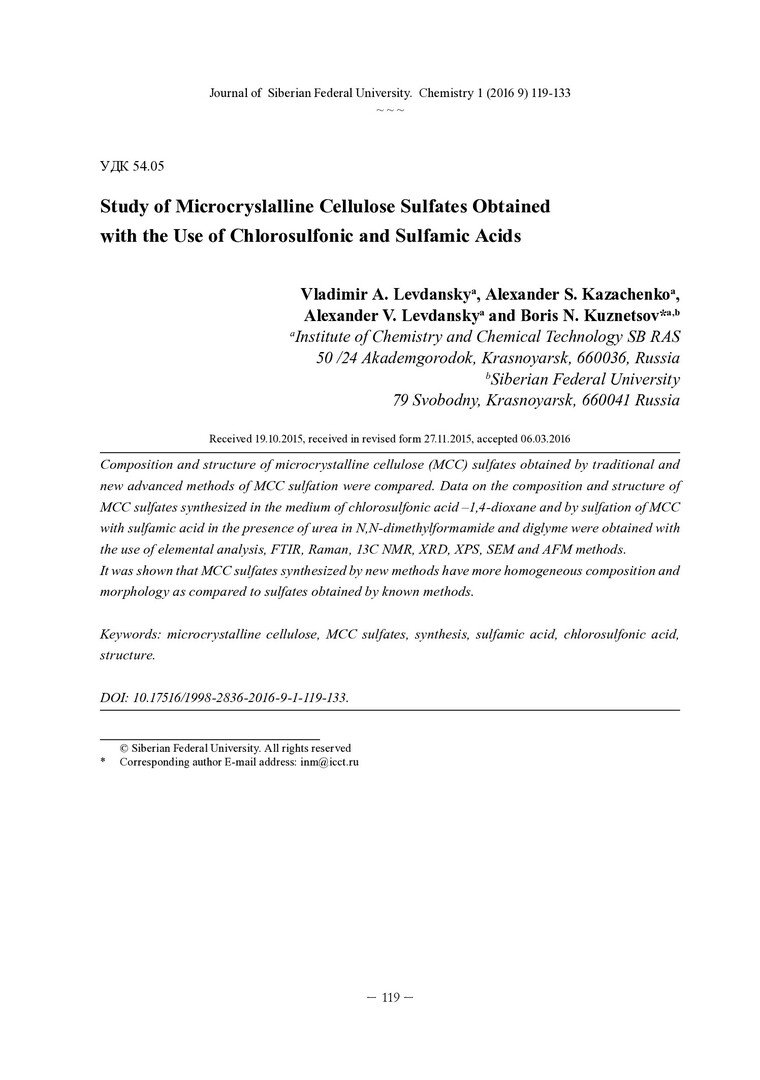 Библиографическое описание:Изучение сульфатов микрокристаллической целлюлозы, полученных с использованием хлорсульфоновой и сульфаминовой кислот = Study of Microcryslalline Cellulose Sulfates Obtained with the Use of Chlorosulfonic and Sulfamic Acids. - Текст : непосредственный // Журнал Сибирского федерального университета. Химия. - 2016. - Т. 9, № 1. -С. 119-133 : ил. - Библиогр.: с. 130-133 (35 назв.). - ISSN 1998-2836.