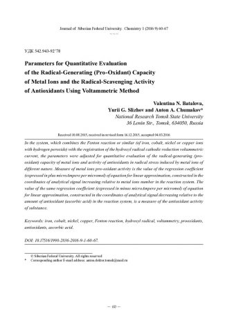 Библиографическое описание:Баталова, В. Н. Параметры количественной оценки радикал-генерирующей (прооксидантной) способности ионов металлов и антирадикальной активности антиоксидантов при использовании вольтамперометрического метода / В. Н. Баталова, Ю. Г. Слижов, А. А. Чумаков = Parameters for Quantitative Evaluation of the Radical-Generating (Pro-Oxidant) Capacity of Metal Ions and the Radical-Scavenging Activity of Antioxidants Using Voltammetric Method. - Текст : непосредственный // Журнал Сибирского федерального университета. Химия. - 2016. - Т. 9, № 1. -С. 60-67 : ил. - Библиогр.: с. 66-67 (9 назв.). - ISSN 1998-2836.