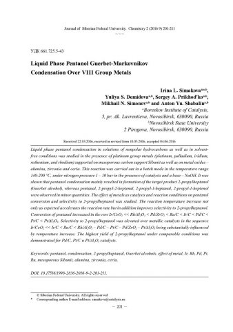 Библиографическое описание: Изучение жидкофазной конденсации пентанола по реакции Гербе-Марковникова на металлах VIII группы = Liquid Phase Pentanol Guerbet-Markovnikov Condensation Over VIII Group Metals. - Текст : непосредственный // Журнал Сибирского федерального университета. Химия. - 2016. - Т. 9, № 2. -С. 201-211 : ил. - Библиогр.: с. 211 (17 назв.). - ISSN 1998-2836.