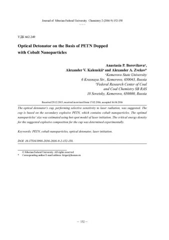 Библиографическое описание: Боровикова, А. П. Optical Detonator on the Basis of PETN Dopped with Cobalt Nanoparticles / А. П. Боровикова, А. В. Каленский, А. А. Звеков = Оптический детонатор на основе ТЭНа, допированного наночастицами кобальта. - Текст : непосредственный // Журнал Сибирского федерального университета. Химия. - 2016. - Т. 9, № 2. -С. 152-158 : ил. - Библиогр.: с. 157-158 (19 назв.). - ISSN 1998-2836.