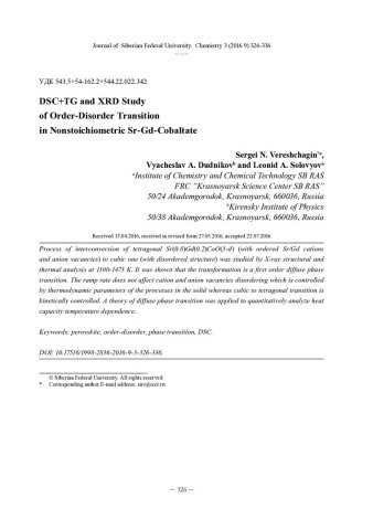 Библиографическое описание:Верещагин, С. Н. Изучение фазового перехода порядок-беспорядок в нестехиометрическом Sr-Gd-кобальтате методами ДСК, ТГ и РСА = DSC+TG and XRD Study of Order-Disorder Transition in Nonstoichiometric Sr-Gd-Cobaltate / С. Н. Верещагин, В. А. Дудников, Л. А. Соловьев. - Текст : непосредственный // Журнал Сибирского федерального университета. Химия. - 2016. - Т. 9, № 3. - С. 326-336 : ил. - Библиогр.: с. 335-336 (26 назв.). - ISSN 1998-2836.