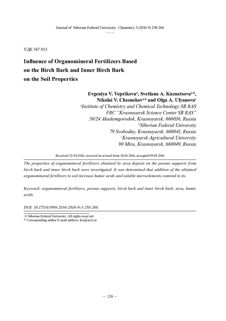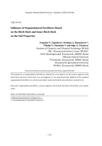 Библиографическое описание:Влияние органоминеральных азотных удобрений на основе коры и луба березы на свойства почвы = Influence of Organomineral Fertilizers Based on the Birch Bark and Inner Birch Bark on the Soil Properties / Е. В. Веприкова [и др.]. - Текст : непосредственный // Журнал Сибирского федерального университета. Химия. - 2016. - Т. 9, № 3. - С. 258-266 : ил. - Библиогр.: с. 265-266 (14 назв.). - ISSN 1998-2836.