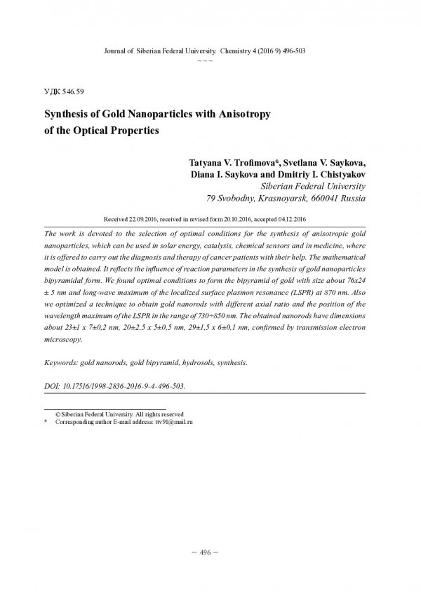 Библиографическое описание:Синтез наночастиц золота, обладающих анизотропией оптических свойств = Synthesis of Gold Nanoparticles with Anisotropy of the Optical Properties / Т. В. Трофимова [и др.]. - Текст : непосредственный // Журнал Сибирского федерального университета. Химия. - 2016. - Т. 9, № 4. - С. 496-503 : ил. - Библиогр.: с. 503 (10 назв.). - ISSN 1998-2836.
