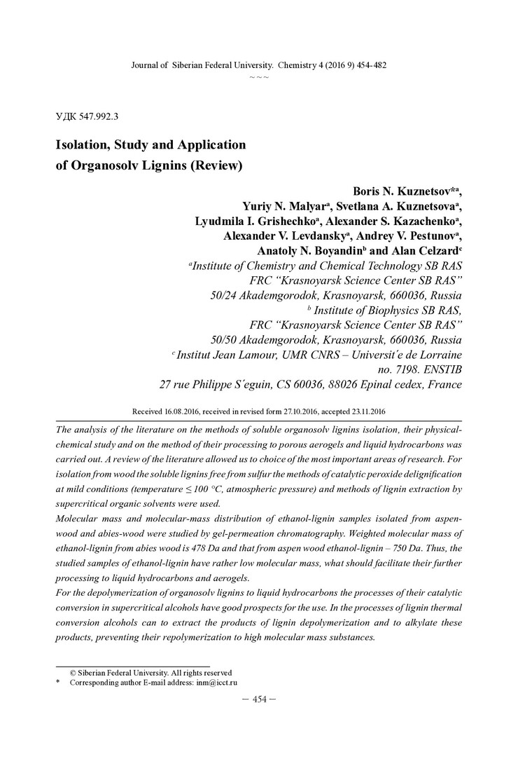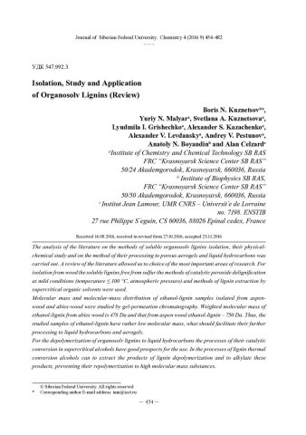 Библиографическое описание:Выделение, изучение и применение органосольвентных лигнинов (обзор) = Isolation, Study and Application of Organosolv Lignins (Review) / Б. Н. Кузнецов [и др.]. - Текст : непосредственный // Журнал Сибирского федерального университета. Химия. - 2016. - Т. 9, № 4. - С. 454-482 : ил. - Библиогр.: с. 473-482 (138 назв.). - ISSN 1998-2836.