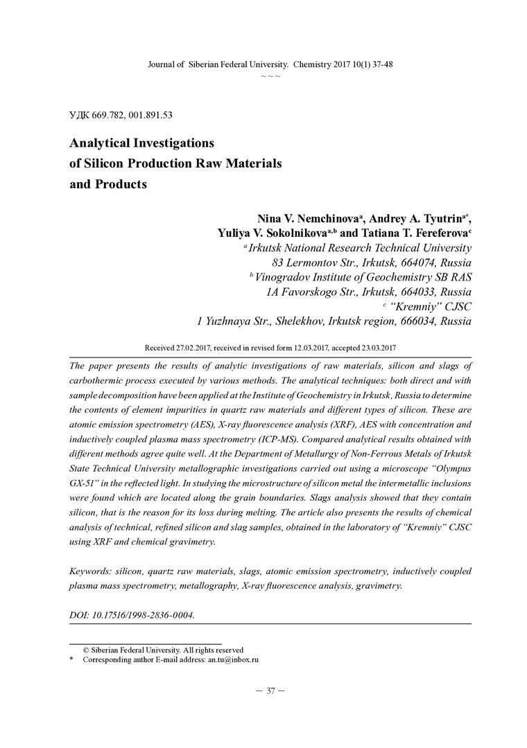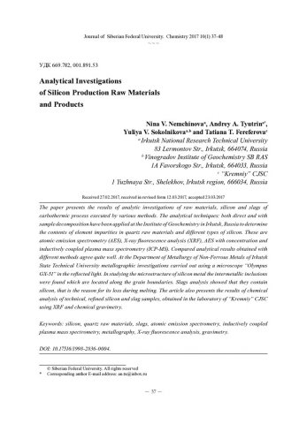 Аннотация:В работе представлены результаты аналитических исследований химического состава рудного сырья, кремния и шлаков карботермического процесса, выполненных с помощью различных методов анализа.
