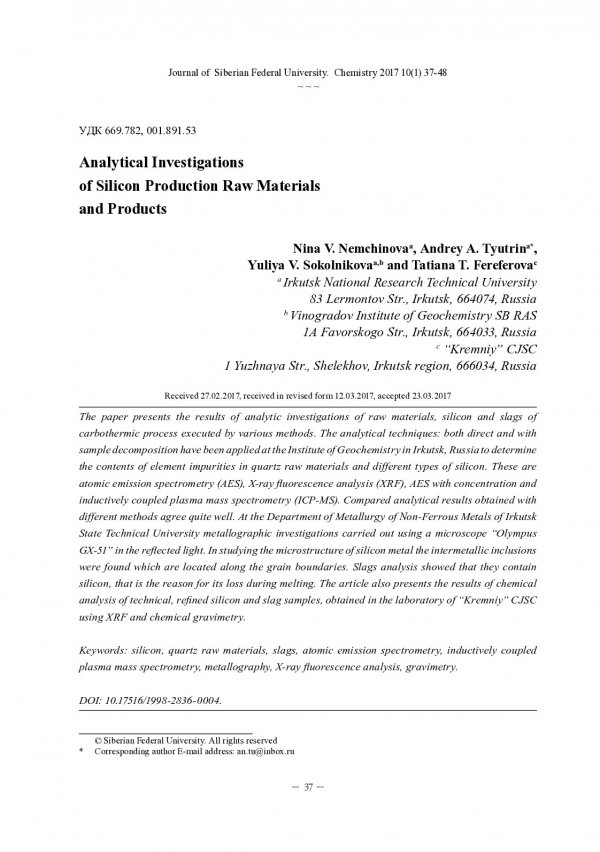 Библиографическое описание:Аналитические исследования сырья и продуктов кремниевого производства = Analytical Investigations of Silicon Production Raw Materials and Products / Н. В. Немчинова [и др.]. - Текст : непосредственный // Журнал Сибирского федерального университета. Химия. - 2017. - Т. 10, № 1. - С. 37-48 : ил. - Библиогр.: с. 47-48 (15 назв.). - ISSN 1998-2836.