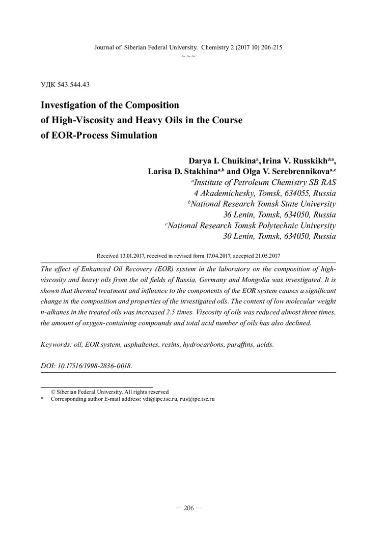 Библиографическое описание:Investigation of the Composition of High-Viscosity and Heavy Oils in the Course of EOR-Process Simulation = Изучение состава высоковязких и тяжелых нефтей в процессе моделирования методов увеличения нефтеотдачи / D. I. Chuikina [и др.]. - Текст : непосредственный // Журнал Сибирского федерального университета. Химия. - 2017. - Т. 10, № 2. - С. 206-215 : ил. - Библиогр.: с. 214-215 (26 назв.). - ISSN 1998-2836.