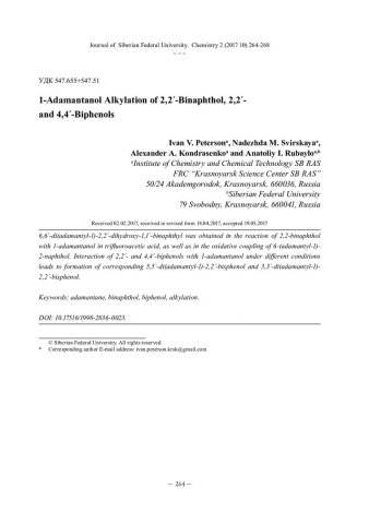 Аннотация:При взаимодействии 2, 2{апостроф}-бинафтола с 1-адамантанолом в трифторуксусной кислоте, а также при окислительном сочетании 6- (адамантил-1) -2-нафтола образуется 6, 6{апостроф}-ди (адамантил- 1) -2, 2{апотроф}-дигидрокси-1, 1{апостроф}-бинафтил. В случае 2, 2{апостроф}- и 4, 4{апостроф}-бифенолов при их взаимодействии с 1-адамантанолом в различных условиях были получены 5, 5{апостроф}-ди (1-адамантил) -2, 2{апостроф}-бифенол и 3, 3{апостроф}- (1-адамантил) -4, 4{апостроф}-бифенол соответственно.