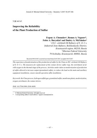 Библиографическое описание:Повышение надежности работы установки производства серы = Improving the Reliability of the Plant Production of Sulfur / Е. А. Чумаков [и др.]. - Текст : непосредственный // Журнал Сибирского федерального университета. Химия. - 2017. - Т. 10, № 3. - С. 437-446 : ил. - Библиогр.: с. 445-446 (8 назв.). - ISSN 1998-2836.