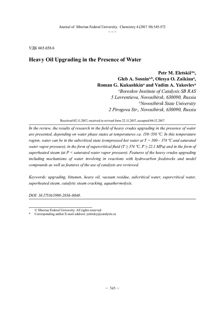 Библиографическое описание:Облагораживание тяжелого нефтяного сырья в присутствии воды = Heavy Oil Upgrading in the Presence of Water / П. М. Елецкий [и др.]. - Текст : непосредственный // Журнал Сибирского федерального университета. Химия. - 2017. - Т. 10, № 4. - С. 545-572 : ил. - Библиогр.: с. 565-572 (127 назв.). - ISSN 1998-2836.