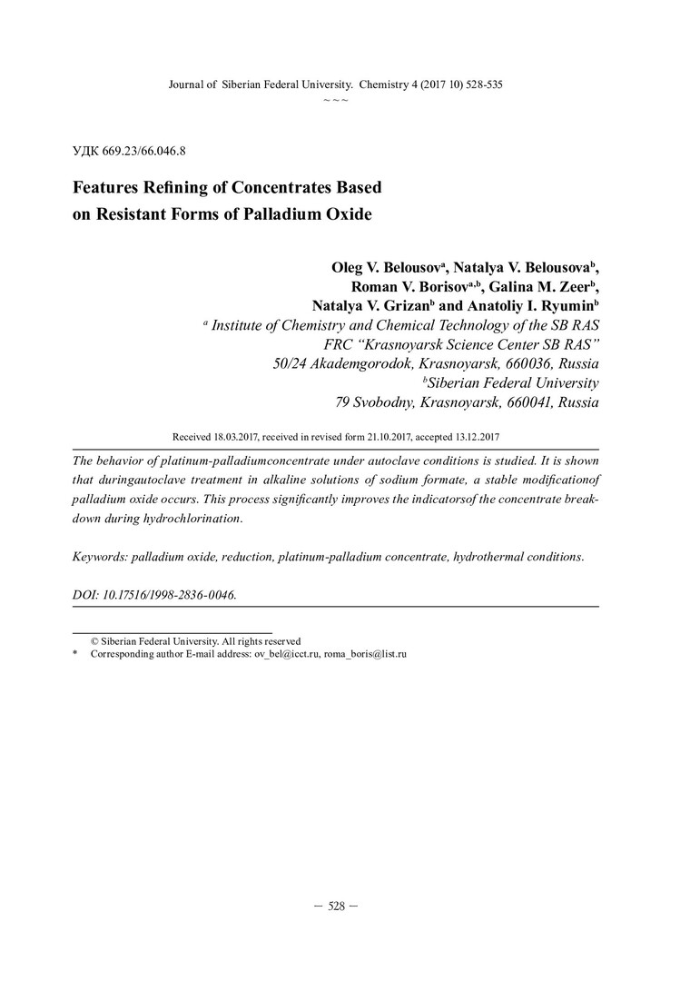 Библиографическое описание:Особенности обогащения концентратов на основе упорных форм оксида палладия = Features Refining of Concentrates Based on Resistant Forms of Palladium Oxide / О. В. Белоусов [и др.]. - Текст : непосредственный // Журнал Сибирского федерального университета. Химия. - 2017. - Т. 10, № 4. - С. 528-535 : ил. - Библиогр.: с. 534-535 (14 назв.). - ISSN 1998-2836.