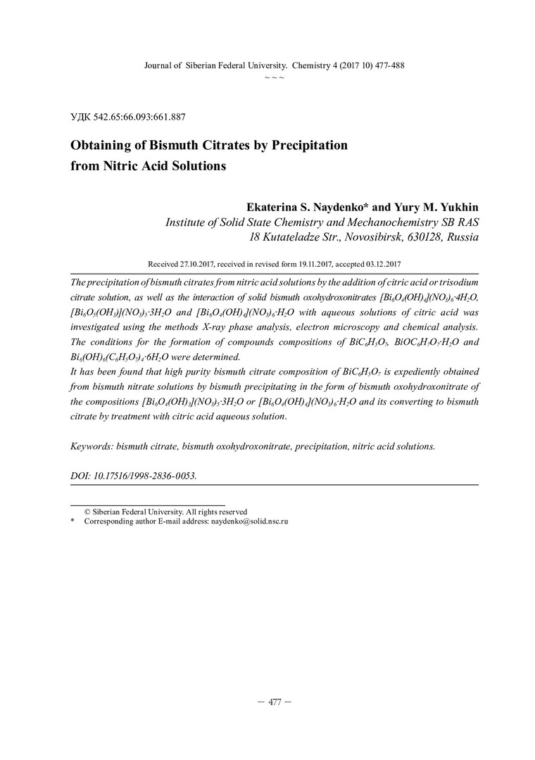 Библиографическое описание:Найденко, Е. С. Получение цитратов висмута осаждением из азотнокислых растворов = Obtaining of Bismuth Citrates by Precipitation from Nitric Acid Solutions / Е. С. Найденко, Ю. М. Юхин. - Текст : непосредственный // Журнал Сибирского федерального университета. Химия. - 2017. - Т. 10, № 4. - С. 477-488 : ил. - Библиогр.: с. 486-488 (23 назв.). - ISSN 1998-2836.