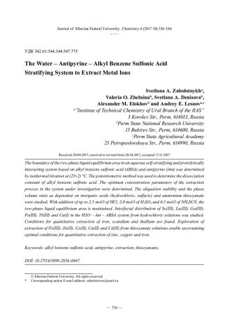 Библиографическое описание:Использование расслаивающейся системы вода – антипирин – алкилбензолсульфокислота для экстракции ионов металлов = The Water - Antipyrine - Alkyl Benzene Sulfonic Acid Stratifying System to Extract Metal Ions / С. А. Заболотных [и др.]. - Текст : непосредственный // Журнал Сибирского федерального университета. Химия. - 2017. - Т. 10, № 4. - С. 536-544 : ил. - Библиогр.: с. 543-544 (20 назв.). - ISSN 1998-2836.