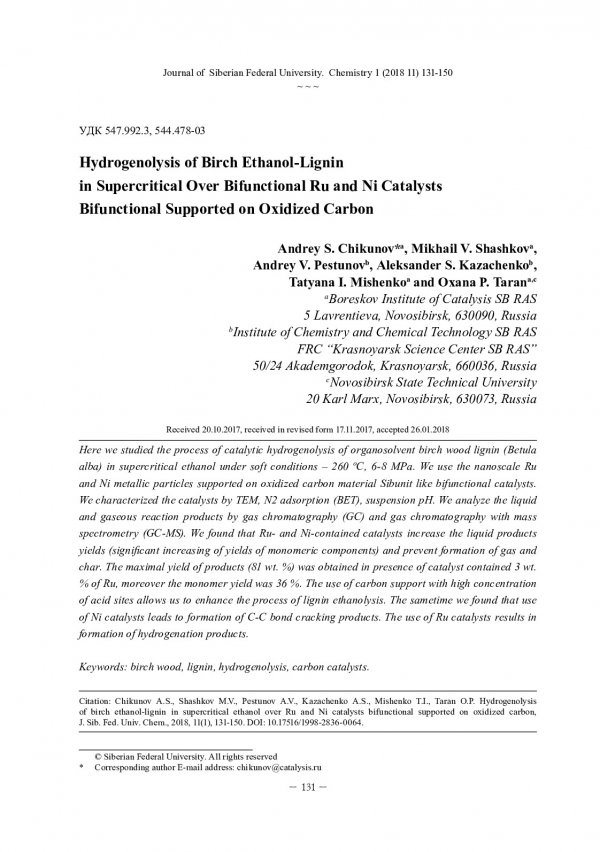 Библиографическое описание:Гидрогенолиз этаноллигнина березы в среде сверхкритического этанола в присутствии бифункциональных Ru- и Ni-содержащих катализаторов, закрепленных на окисленном углеродном носителе = Hydrogenolysis of Birch Ethanol-Lignin in Supercritical Over Bifunctional Ru and Ni Catalysts Bifunctional Supported on Oxidized Carbon / А. С. Чикунов [и др.]. - Текст : непосредственный // Журнал Сибирского федерального университета. Химия. - 2018. - Т. 11, № 1. - С. 131-150 : ил. - Библиогр.: с. 148-149 (29 назв.). - ISSN 1998-2836.