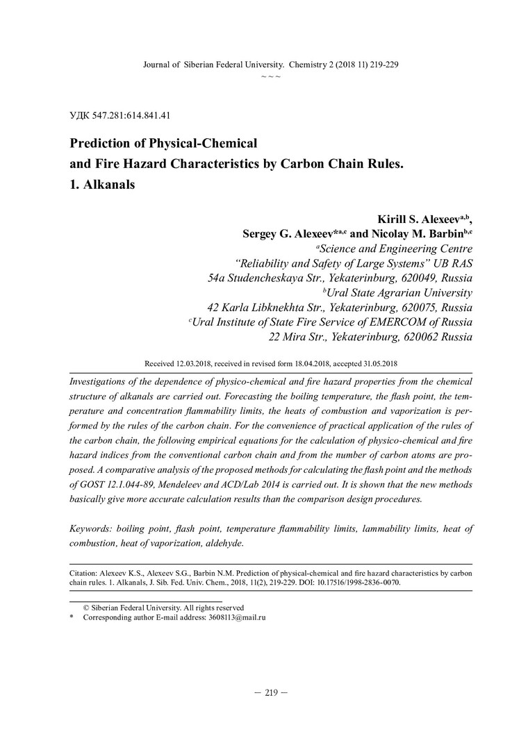 Аннотация:Проведено исследование зависимости физико-химических и пожароопасных свойств от химического строения алканалей. С помощью правил углеродной цепи выполнено прогнозирование температур кипения и вспышки, температурных и концентрационных пределов воспламенения, теплот сгорания и парообразования.