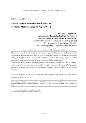 Библиографическое описание:Структура и электрохимические свойства пористого материала на основе древесины осины = Structure and Electrochemical Properties of Porous Material Based on Aspen Wood / С. И. Цыганова [и др.]. - Текст : непосредственный // Журнал Сибирского федерального университета. Химия. - 2018. - Т. 11, № 2. - С. 281-290 : ил. - Библиогр.: с. 289-290 (17 назв.). - ISSN 1998-2836.