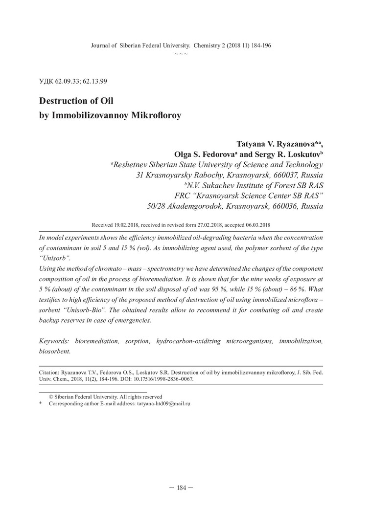 Библиографическое описание: Рязанова, Т. В. Деструкция нефти иммобилизованной микрофлорой = Destruction of Oil by Immobilizovannoy Mikrofloroy / Т. В. Рязанова, О. С. Федорова, С. Р. Лоскутов. - Текст : непосредственный // Журнал Сибирского федерального университета. Химия. - 2018. - Т. 11, № 2. - С. 184-196 : ил. - Библиогр.: с. 194-196 (17 назв.). - ISSN 1998-2836.