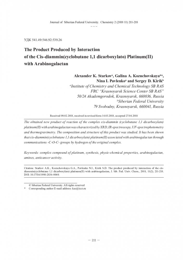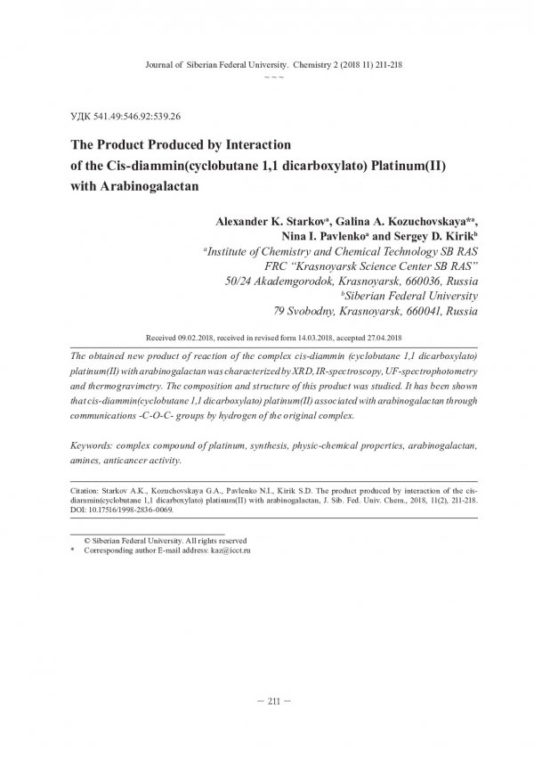Ключевые слова:амины, арабиногалактан, комплексные соединения, платина, свойства физико-химические, синтез, соединения комплексные, физико-химические свойства