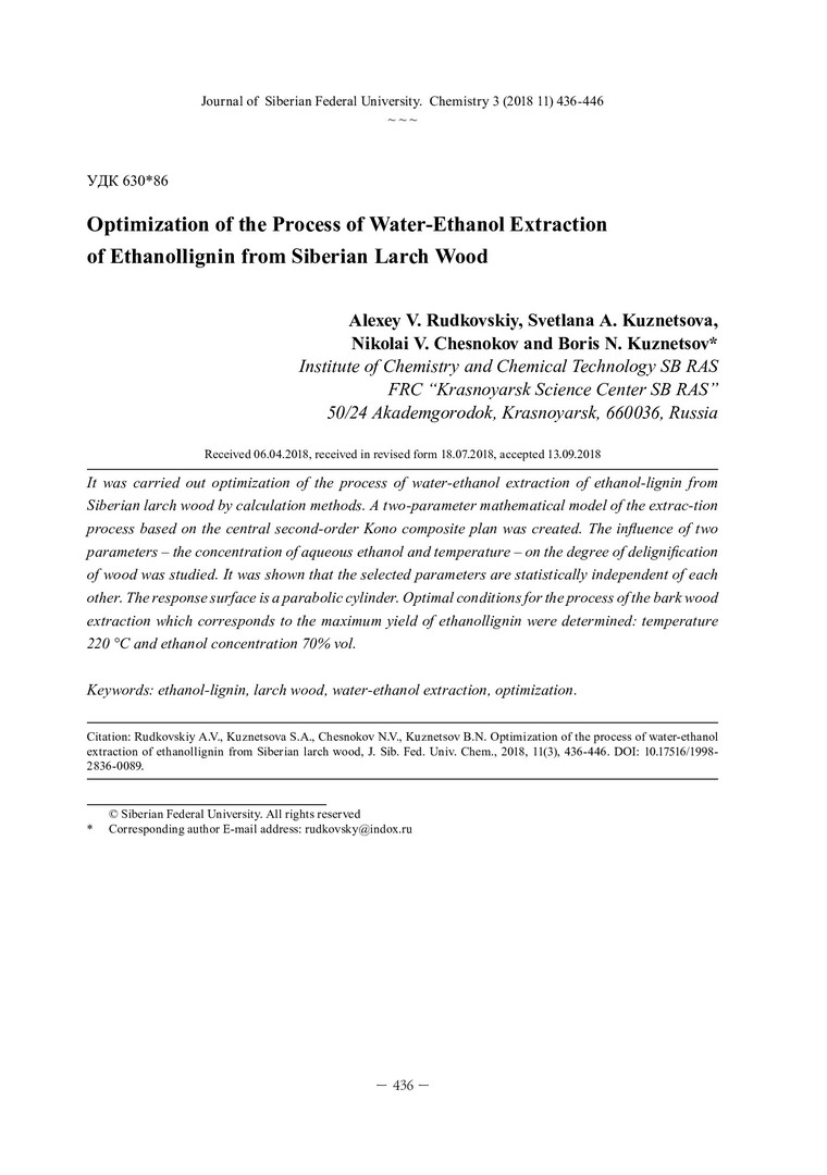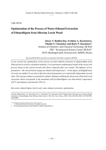 Библиографическое описание:Оптимизация процесса водно-этанольной экстракции этаноллигнина из древесины лиственницы сибирской = Optimization of the Process of Water-Ethanol Extraction of Ethanollignin from Siberian Larch Wood / А. В. Рудковский [и др.]. - Текст : непосредственный // Журнал Сибирского федерального университета. Химия. - 2018. - Т. 11, № 3. - С. 436-446 : ил. - Библиогр.: с. 445-446 (10 назв.). - ISSN 1998-2836.