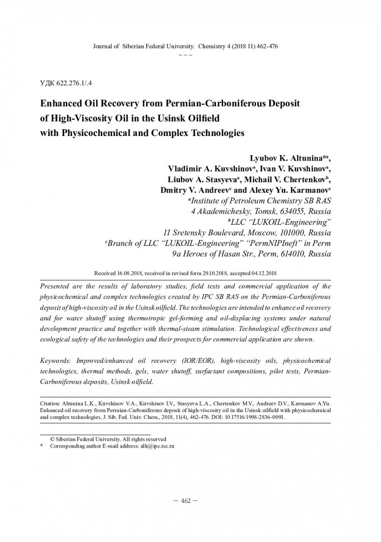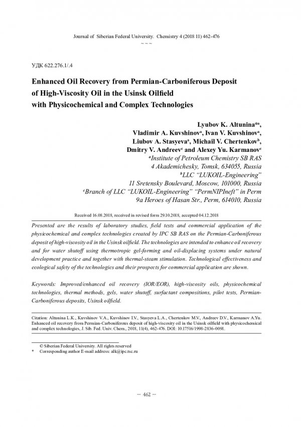 Библиографическое описание:Увеличение нефтеотдачи пермо-карбоновой залежи высоковязкой нефти Усинского месторождения физико-химическими и комплексными технологиями (обзор) = Enhanced Oil Recovery from Permian-Carboniferous Deposit of High-Viscosity Oil in the Usinsk Oilfield with Physicochemical and Complex Technologies / Л. К. Алтунина [и др.]. - Текст : непосредственный // Журнал Сибирского федерального университета. Химия. - 2018. - Т. 11, № 4. - С. 462-476 : ил. - Библиогр.: с. 475-476 (13 назв.). - ISSN 1998-2836.