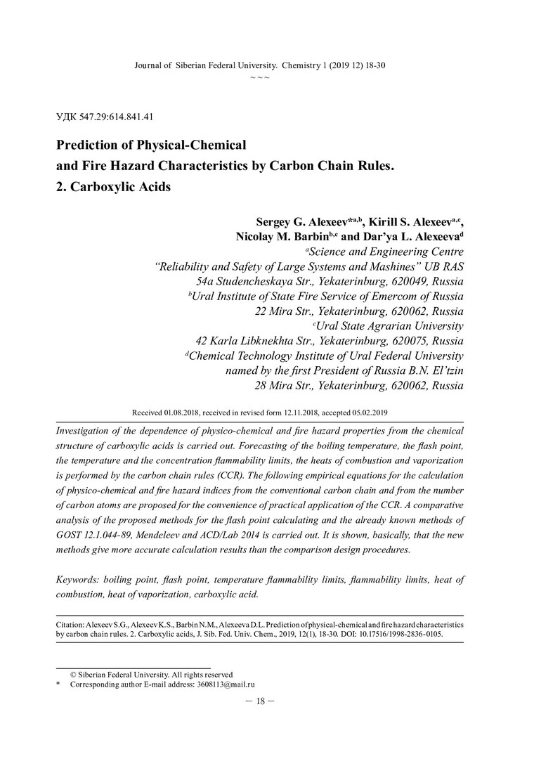 Библиографическое описание:Prediction of physical-chemical and fire hazard characteristics by carbon chain rules = Прогнозирования физико-химических и пожароопасных показателей с помощью правил углеродной цепи. 2. Carboxylic Acids ; 2. Карбоновые кислоты / S. G. Alexeev [и др.]. - Текст : непосредственный // Журнал Сибирского федерального университета. Химия. - 2019. - Т. 12, № 1. - С. 18-30 : ил. - Библиогр.: с. 29-30 (16 назв.). - ISSN 1998-2836.