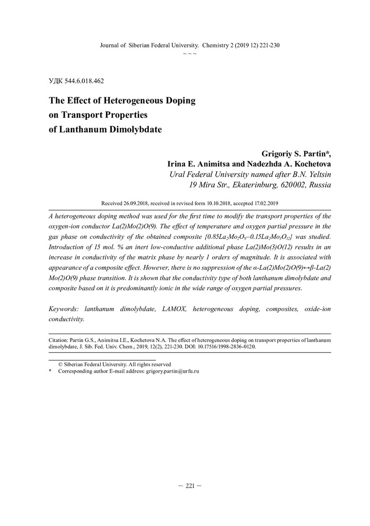 Библиографическое описание:Партин, Г. С. Влияние гетерофазного допирования на транспортные свойства димолибдата лантана = The Effect of Heterogeneous Doping on Transport Properties of Lanthanum Dimolybdate / Г. С. Партин, И. Е. Анимица, Н. А. Кочетова. - Текст : непосредственный // Журнал Сибирского федерального университета. Химия. - 2019. - Т. 12, № 2. - С. 221-230 : ил. - Библиогр.: с. 229-230 (25 назв.). - ISSN 1998-2836.