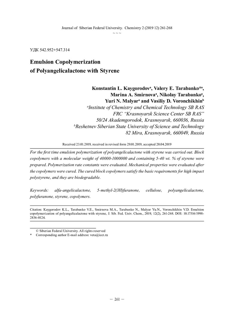 Библиографическое описание:Эмульсионная сополимеризация полиангеликалактона и стирола = Emulsion Copolymerization of Polyangelicalactone with Styrene / К. Л. Кайгородов [и др.]. - Текст : непосредственный // Журнал Сибирского федерального университета. Химия. - 2019. - Т. 12, № 2. - С. 261-268 : ил. - Библиогр.: с. 268 (9 назв.). - ISSN 1998-2836.