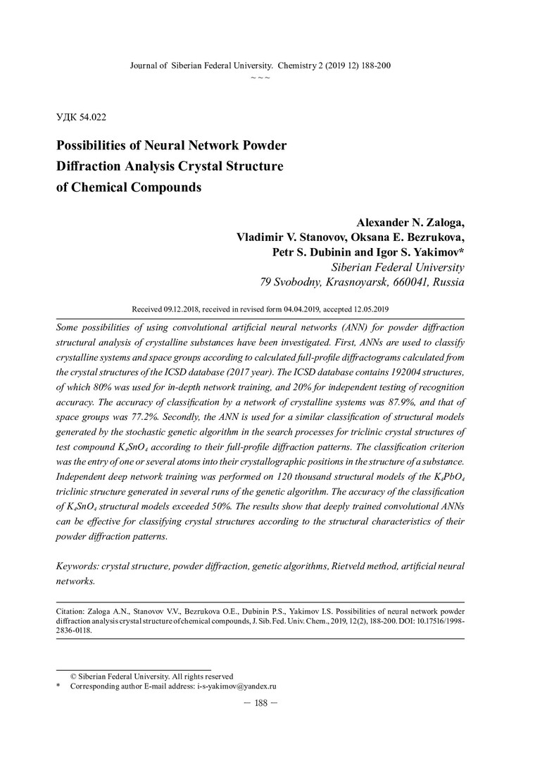 Библиографическое описание:Возможности нейросетевого порошкового дифракционного анализа кристаллической структуры химических соединений = Possibilities of Neural Network Powder Diffraction Analysis Crystal Structure of Chemical Compounds / А. Н. Залога [и др.]. - Текст : непосредственный // Журнал Сибирского федерального университета. Химия. - 2019. - Т. 12, № 2. - С. 188-200 : ил. - Библиогр.: с. 199-200 (22 назв.). - ISSN 1998-2836.