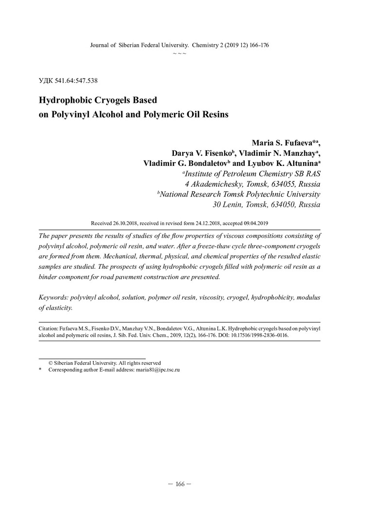 Библиографическое описание:Криогели на основе поливинилового спирта и нефтеполимерных смол с гидрофобными свойствами = Hydrophobic Cryogels Based on Polyvinyl Alcohol and Polymeric Oil Resins / М. С. Фуфаева [и др.]. - Текст : непосредственный // Журнал Сибирского федерального университета. Химия. - 2019. - Т. 12, № 2. - С. 166-176 : ил. - Библиогр.: с. 174-176 (15 назв.). - ISSN 1998-2836.