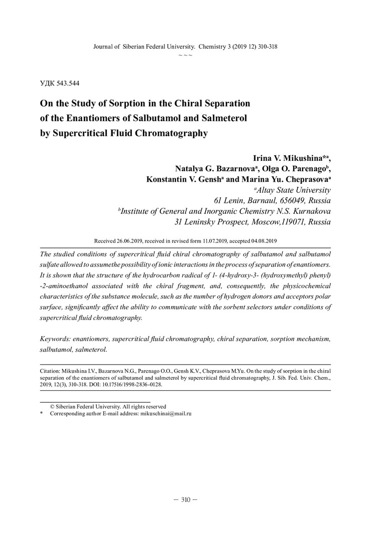 Библиографическое описание:К вопросу об изучении сорбции при хиральном разделении энантиомеров сальбутамола и сальметерола методом сверхкритической флюидной хроматографии = On the Study of Sorption in the Chiral Separation of the Enantiomers of Salbutamol and Salmeterol by Supercritical Fluid Chromatography / И. В. Микушина [и др.]. - Текст : непосредственный // Журнал Сибирского федерального университета. Химия. - 2019. - Т. 12, № 3. - С. 310-318 : ил. - Библиогр.: с. 317-318 (13 назв.). - ISSN 1998-2836.