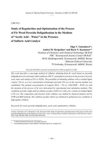 Библиографическое описание:Яценкова, О. В. Изучение закономерностей и оптимизация процесса пероксидной делигнификации древесины ели в среде "уксусная кислота – вода" в присутствии сернокислотного катализатора = Study of Regularities and Optimization of the Process of Fir Wood Peroxide Delignification in the Medium of "Acetic Acid – Water" in the Presence of Sulfuric Acid Catalyst / О. В. Яценкова, А. М. Скрипников, Б. Н. Кузнецов. - Текст : непосредственный // Журнал Сибирского федерального университета. Химия. - 2019. - Т. 12, № 4. - С. 590-603 : ил. - Библиогр.: с. 602-603 (25 назв.). - ISSN 1998-2836.