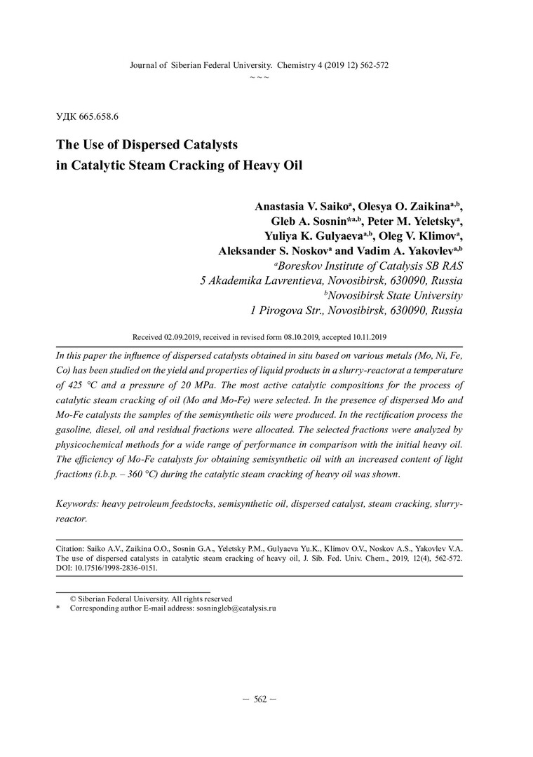 Библиографическое описание:Использование дисперсных катализаторов в процессе каталитического парового крекинга тяжелой нефти = The Use of Dispersed Catalysts in Catalytic Steam Cracking of Heavy Oil / А. В. Сайко [и др.]. - Текст : непосредственный // Журнал Сибирского федерального университета. Химия. - 2019. - Т. 12, № 4. - С. 562-572 : ил. - Библиогр.: с. 571-572 (11 назв.). - ISSN 1998-2836.