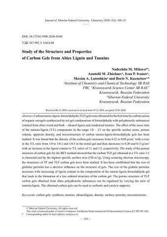 Библиографическое описание:Изучение строения и свойств углеродных гелей из лигнина и таннинов пихты = Study of the structure and properties of carbon gels from abies lignin and tannins / Н. М. Микова, А. М. Жижаев, И. П. Иванов [и др.]. - Текст : непосредственный // Журнал Сибирского федерального университета. Химия. - 2020. - Т. 13, № 1. - С. 109-121 : ил. - Библиогр.: с. 119-121 (34 назв.). - ISSN 1998-2836.