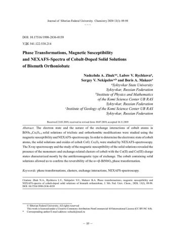 Библиографическое описание:Фазовые превращения, магнитная восприимчивость и NEXAFS-спектры кобальтсодержащих твердых растворов ортониобата висмута = Phase transformations, magnetic susceptibility and nexafs-spectra of cobalt-doped solid solutions of bismuth orthoniobate / Н. А. Жук, Л. В. Рычкова, С. В. Некипелов, Б. А. Макеев. - Текст : непосредственный // Журнал Сибирского федерального университета. Химия. - 2020. - Т. 13, № 1. - С. 89-98 : ил. - Библиогр.: с. 97-98 (24 назв.). - ISSN 1998-2836.