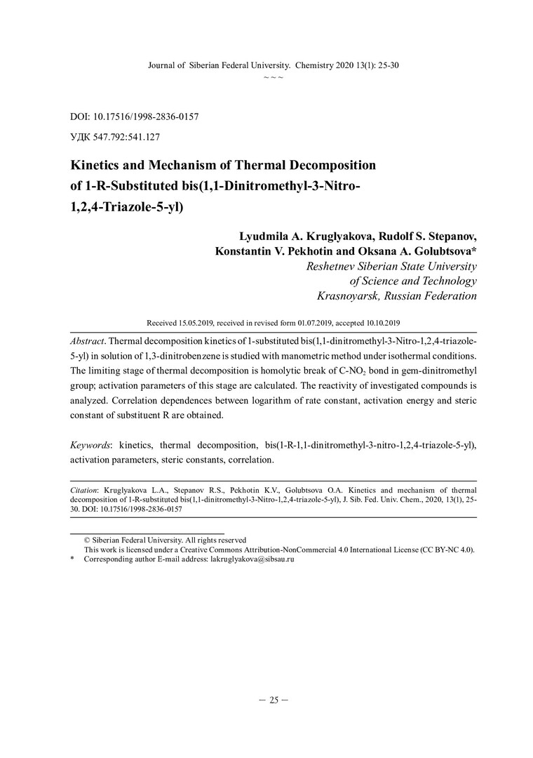 Библиографическое описание:Kinetics and Mechanism of Thermal Decomposition of 1-R-Substituted bis(1,1-Dinitromethyl-3-Nitro- 1,2,4-Triazole-5-yl) = Кинетика и механизм термического разложения 1-r-замещенного бис(1,1-динитрометил-3-нитро- 1,2,4-триазол-5-ила) / Л. А. Круглякова, Р. С. Степанов, К. В. Пехотин, О. А. Голубцова. - Текст : непосредственный // Журнал Сибирского федерального университета. Химия. - 2020. - Т. 13, № 1. - С. 25-30 : ил. - Библиогр.: с. 29-30 (12 назв.). - ISSN 1998-2836.