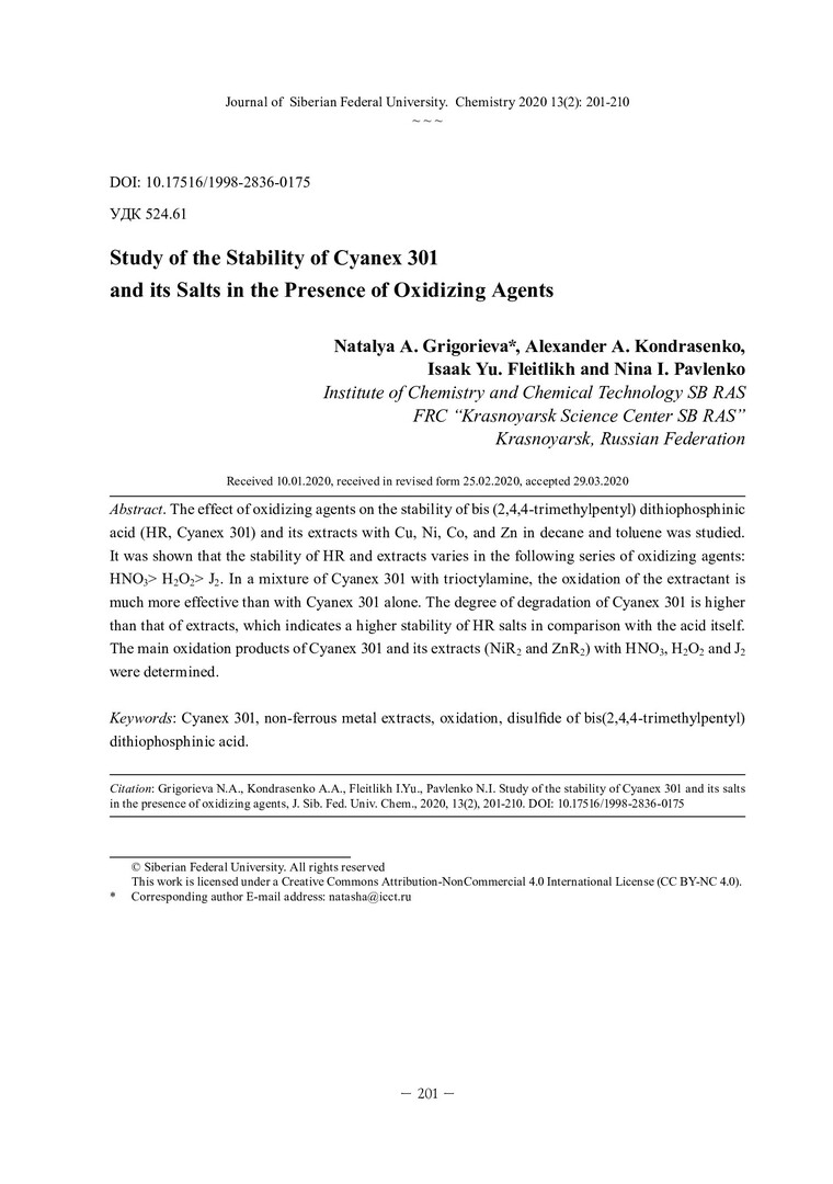 Библиографическое описание:Иcследование устойчивости Цианекс 301 и его солей в присутствии окислителей = Study of the stability of Cyanex 301 and its salts in the presence of oxidizing agents / Н. А. Григорьева, А. А. Кондрасенко, И. Ю. Флейтлих, Н. И. Павленко. - Текст : непосредственный // Журнал Сибирского федерального университета. Химия. - 2020. - Т. 13, № 2. - С. 201-210 : ил. - Библиогр.: с. 209-210 (14 назв.). - ISSN 1998-2836.