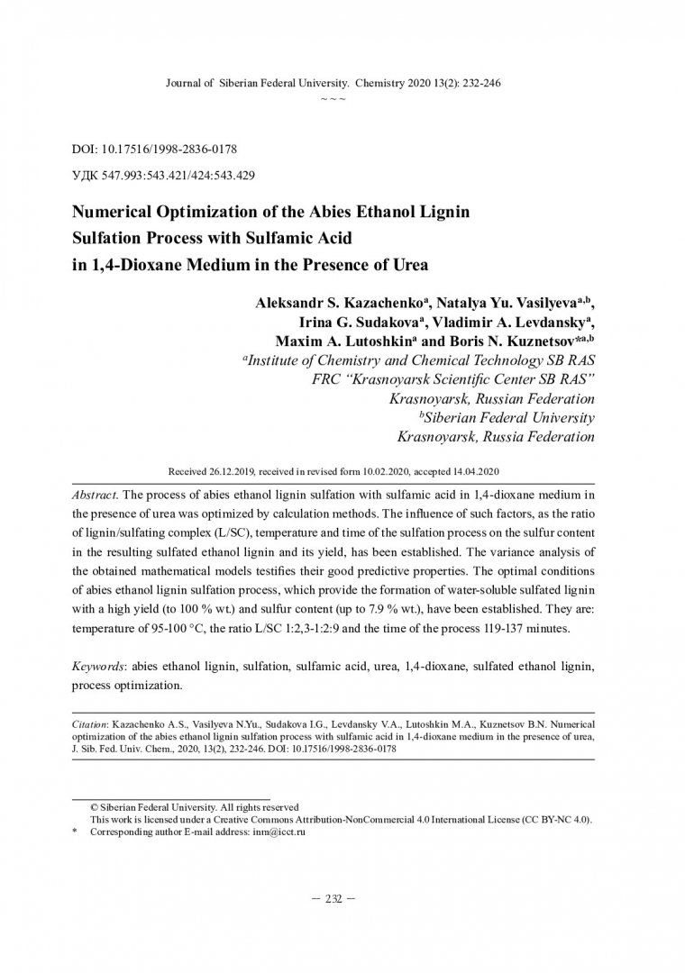 Библиографическое описание:Численная оптимизация процесса сульфатирования этаноллигнина древесины пихты сульфаминовой кислотой в среде 1,4-диоксана в присутствии мочевины = Numerical optimization of the abies ethanol lignin sulfation process with sulfamic acid in 1,4-dioxane medium in the presence of urea / А. С. Казаченко, Н. Ю. Васильева, И. Г. Судакова [и др.]. - Текст : непосредственный // Журнал Сибирского федерального университета. Химия. - 2020. - Т. 13, № 2. - С. 232-246 : ил. - Библиогр.: с. 245-246 (22 назв.). - ISSN 1998-2836.