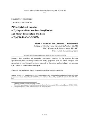 Библиографическое описание:Верпекин, В. В. Синтез CP(CO)[2]Fe-C тождественность C-COOMe через PD/CU-катализируемое сочетание циклопентадиенилдикарбонилиодида железа и метилпропиолата = PD/CU-catalyzed coupling of cyclopentadienyliron dicarbonyl iodide and methyl propiolate in synthesis of CP(CO)[2]Fe-C тождественность C-COOMe / В. В. Верпекин, А . А. Кондрасенко. - Текст : непосредственный // Журнал Сибирского федерального университета. Химия. - 2020. - Т. 13, № 2. - С. 297-303 : ил. - Библиогр.: с. 302-303 (18 назв.). - ISSN 1998-2836.