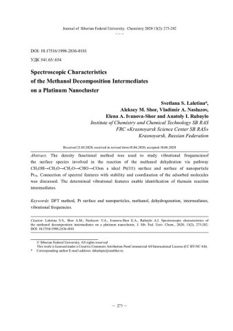 Библиографическое описание:Спектроскопические характеристики интермедиатов разложения метанола на нанокластере платины = Spectroscopic characteristics of the methanol decomposition intermediates on a platinum nanocluster / С. С. Лалетина, А. М. Шор, В. А. Наслузов [и др.]. - Текст : непосредственный // Журнал Сибирского федерального университета. Химия. - 2020. - Т. 13, № 2. - С. 273-282 : ил. - Библиогр.: с. 280-282 (29 назв.). - ISSN 1998-2836.