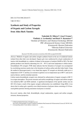 Библиографическое описание:Синтез и изучение свойств органических и углеродных ксерогелей из танинов коры пихты = Synthesis and study of properties of organic and carbon xerogels from abies bark tannins / Н. М. Микова, И. П. Иванов, В. А. Левданский, Б. Н. Кузнецов. - Текст : непосредственный // Журнал Сибирского федерального университета. Химия. - 2020. - Т. 13, № 2. - С. 175-188 : ил. - Библиогр.: с. 187-188 (35 назв.). - ISSN 1998-2836.